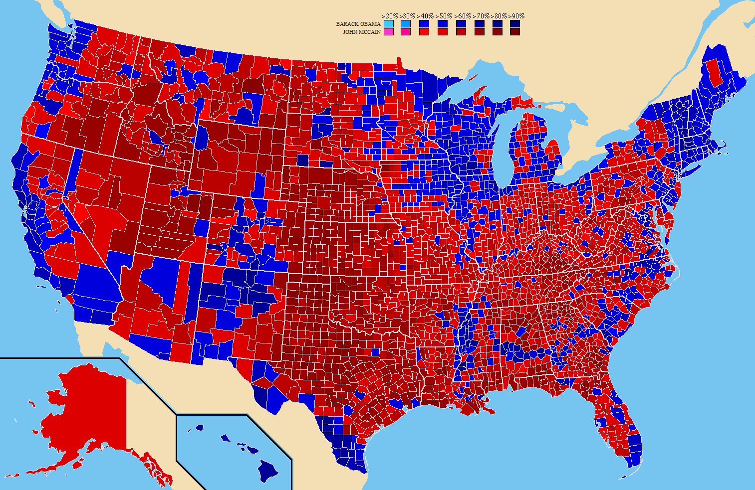 A suggested better representation is using bubbles with sizes proportional of the number of votes, ending with this map showing more correctly a majority of blue instead.