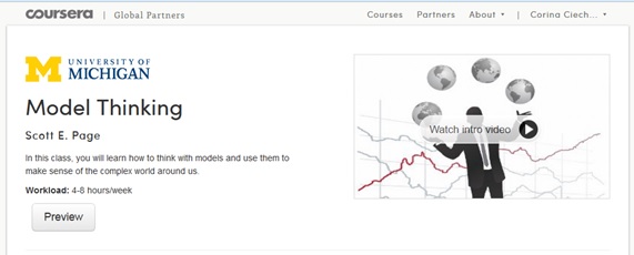 Massive Open Online Courses (MOOC) are very recent, but are quickly gaining popularity. Coursera is one of the big platforms that offer those free courses, along with edX and Khanacademy just to mention a few. Last year I took a fantastic course offered by Coursera called ‘Model Thinking’ given by Prof. Scott E. Page, who’s the Director of the Center for the Study of Complex Systems at the University of Michigan ( I posted already about it here : – ).